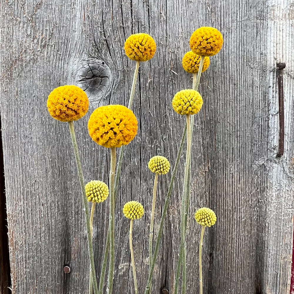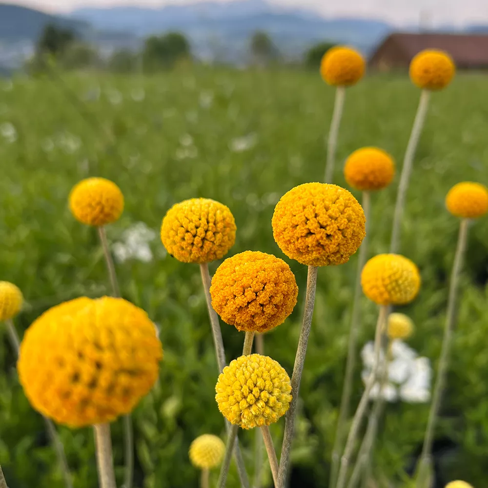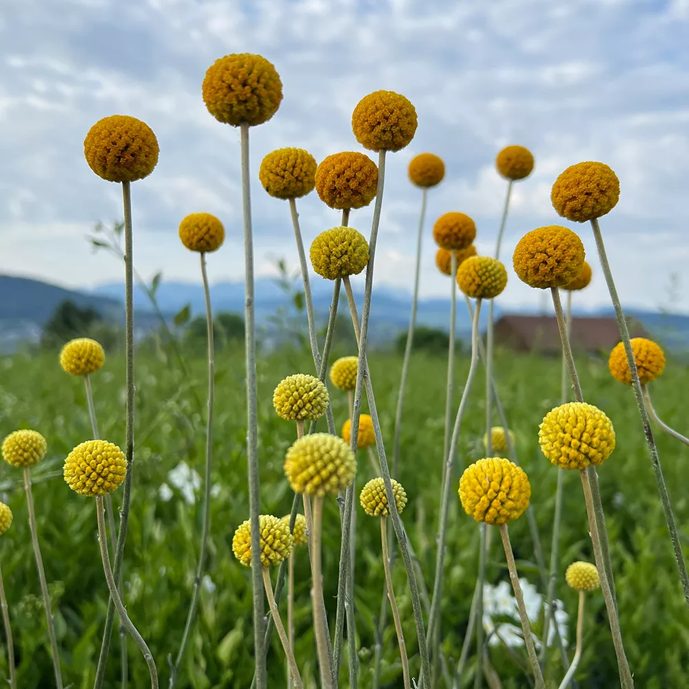 Der Trommelschlägel ist ein dekoratives Highlight für Garten und Heim. Die einzigartigen Blüten zeigen sich vom Juni bis Oktober und geben dem Garten ein verspielten Farbtupfer.Nach der Blütenzeit können die farbenprachtigen Craspedia als Trockenblume,naturbelassen oder gefärbt dein Wohnraum verschönern.