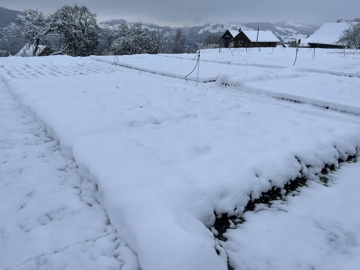Auch wenn es nur eine dünne Schneeschicht ist die tagsüber auftaut und in der Nacht wieder friert, ist diese dünne Schicht ein Schutzmantel für die Stauden. Nur so können wir dieses Jahr wieder starke und abgehärtete Stauden produzieren.